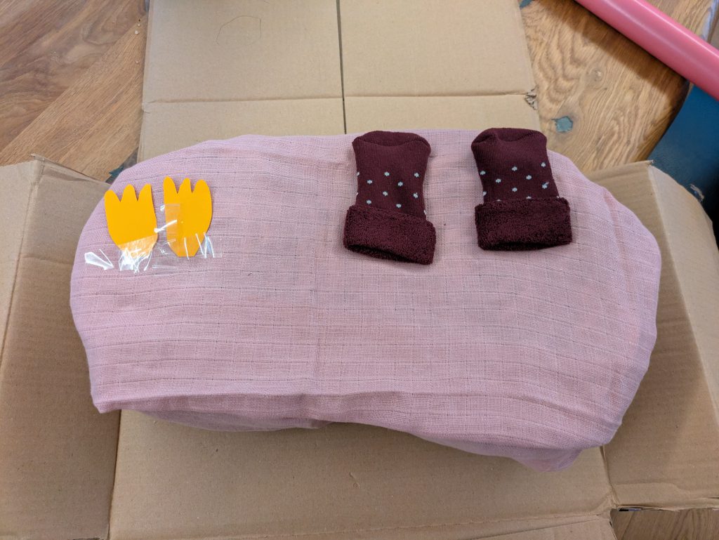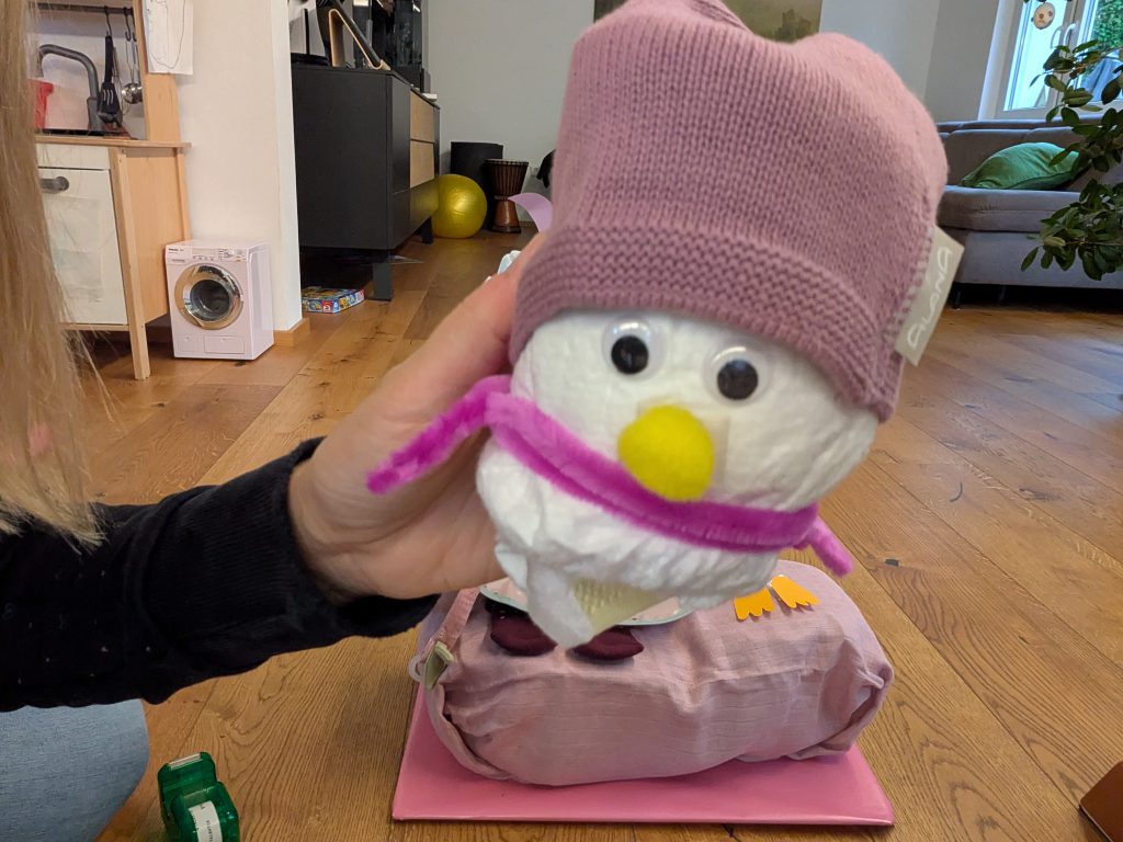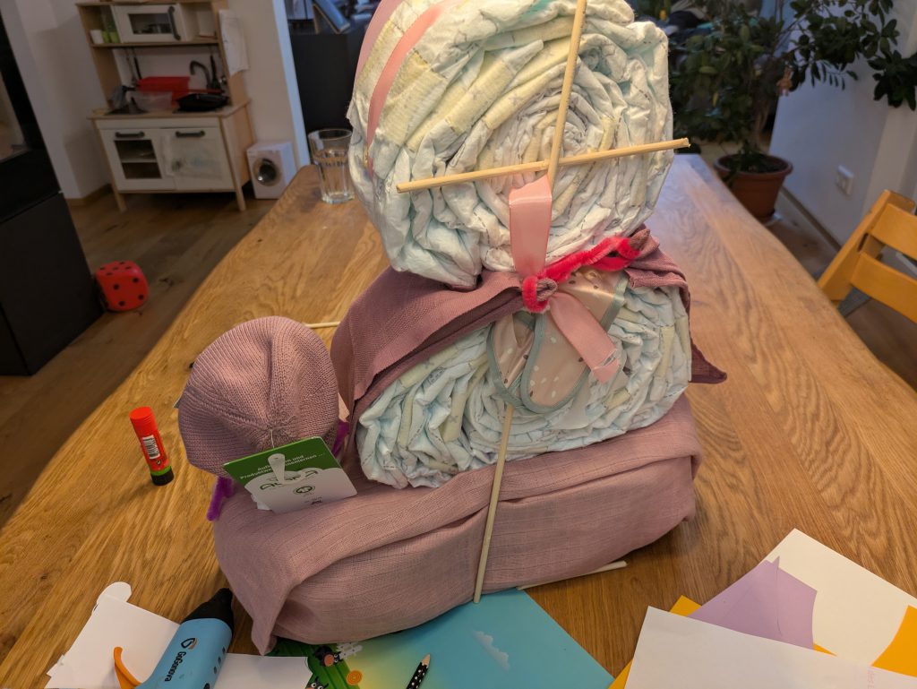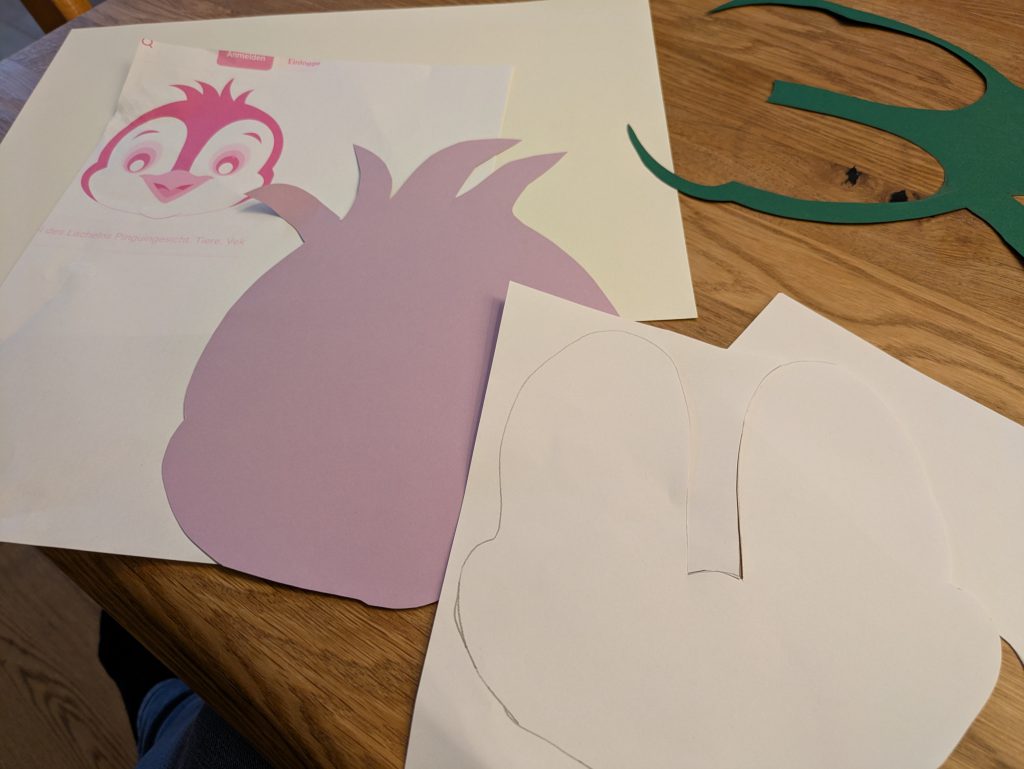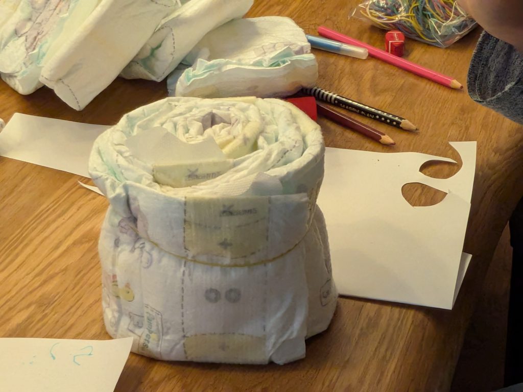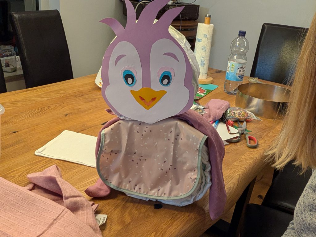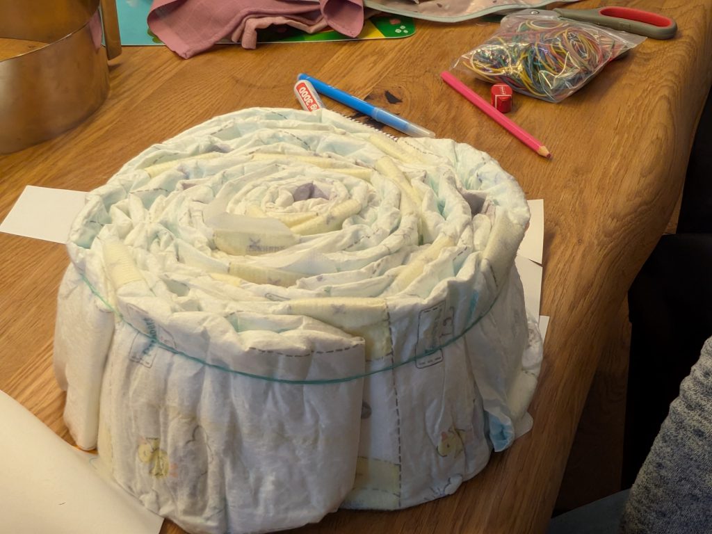 Insgesamt werden 4 Kreise benötigt. 2 Größere, und 2 etwas kleinere. 1 Paar für den großen Pinguin, und 1 Paar für die Eisscholle. Zudem wird für den kleinen Pinguin 1-3 Windeln benötigt, die zusammengerollt werden. Hierzu nehme ich den Tortenring zur Hilfe, und befestige ich den Kreis mit einem Gummi.